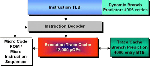 Кэш трассировки выполнения (Execution Trace Cache) Pentium 4 не испытывает вышеописанных проблем. Идея кэша трассировки фактически весьма проста, но для этого требуется больше "кремниевых ресурсов" и конструкторской квалификации, для замещения старого доброго L1-кэша инструкций. По существу, кэш трассировки это ничто иное как L1-кэш инструкций находящийся после декодера.